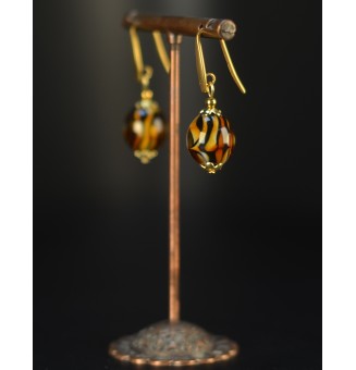 23,00 €Boucles d’oreilles en acier inoxydable avec 2 perles de verre filé artisanales : une perle ronde motif léopard et une perle plate ronde ambre.