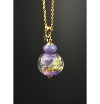 Au cœur du pendentif, une perle de verre de 1,35 cm de diamètre renferme une délicate inclusion de feuille d’or, offrant un éclat raffiné et des reflets chaleureux. Chaque perle est un exemplaire unique, née du travail minutieux du verre en fusion.