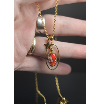 Au cœur du pendentif, une perle de verre rouge renferme une délicate inclusion de feuille d’or, offrant un éclat raffiné et des reflets chaleureux. Chaque perle est un exemplaire unique, née du travail minutieux du verre en fusion.