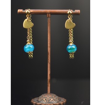 22,00 €Boucles d’oreilles pendantes en acier inoxydable doré au design double pendant, avec un élément à l’avant et à l’arrière de l’oreille. Elles sont ornées de perles de verre filées au chalumeau, uniques, de couleur bleu vert, et d’une délicate breloque cœur. Longueur : 4.5 cm. Création artisanale unique signée Liloo Créations.