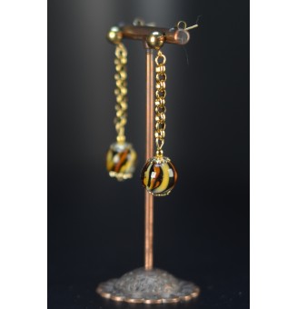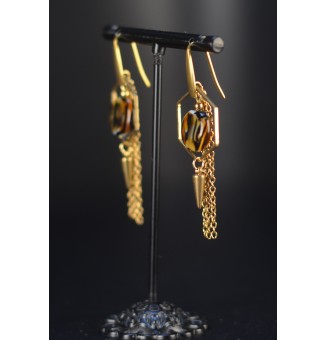 23,00 €Boucles d’oreilles en acier inoxydable doré avec 2 perles de verre filé artisanales : une perle ronde motif léopard et une perle plate ronde ambre.