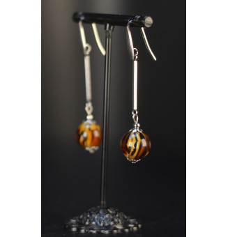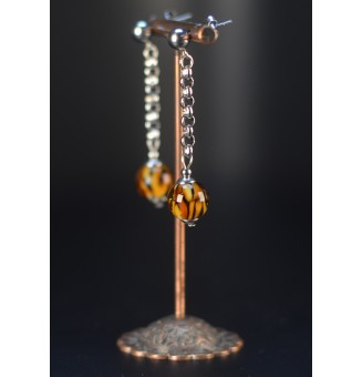 23,00 €Boucles d’oreilles en acier inoxydable avec 2 perles de verre filé artisanales : une perle ronde motif léopard et une perle plate ronde ambre.