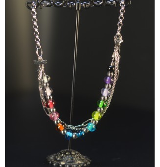 30,00 €Bracelet multi-rangs en acier inoxydable argenté, orné de perles de verre filé multicolores du jaune au violet. Montage original avec différentes chaînes aux maillons variés. Modèle réglable, adapté aux poignets de 15 à 20 cm. Création artisanale unique.