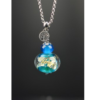 Collier long en perles artisanales en verre filé – Bleu-vert translucide & feuille d’argent