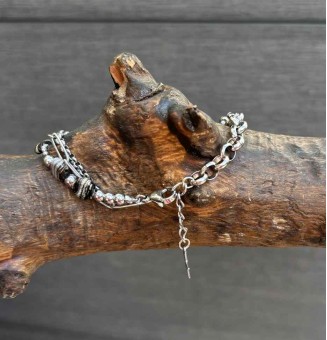 Entièrement conçu à la main dans l’atelier de l’artisane à Orange, ce bracelet se distingue par sa chaîne en acier inoxydable composée de plusieurs rangs aux maillons variés, qui se superposent harmonieusement pour un rendu à la fois graphique et élégant.