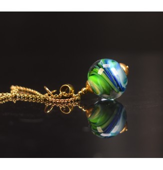 26,00 €Collier long de 72 cm en acier inoxydable doré, orné d’une grande perle artisanale en verre filé bleu et vert de 2,25 cm de diamètre. Mélange aléatoire aux multiples reflets, accompagné d’une délicate breloque cœur. Création unique faite main. 💙💚