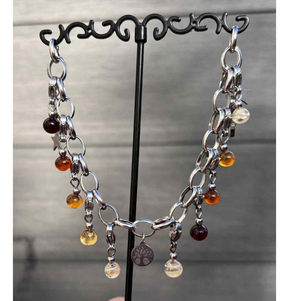 Bracelet charms en acier inoxydable, orné de perles en verre filé ambré faites main et d’un arbre de vie central. Ses 9 charms interchangeables offrent une modularité totale. Fermoir attache rapide, facile à mettre seule. Bijou artisanal unique, ajustable de 15 à 20 cm, créé dans l’atelier Liloo Créations à Orange.