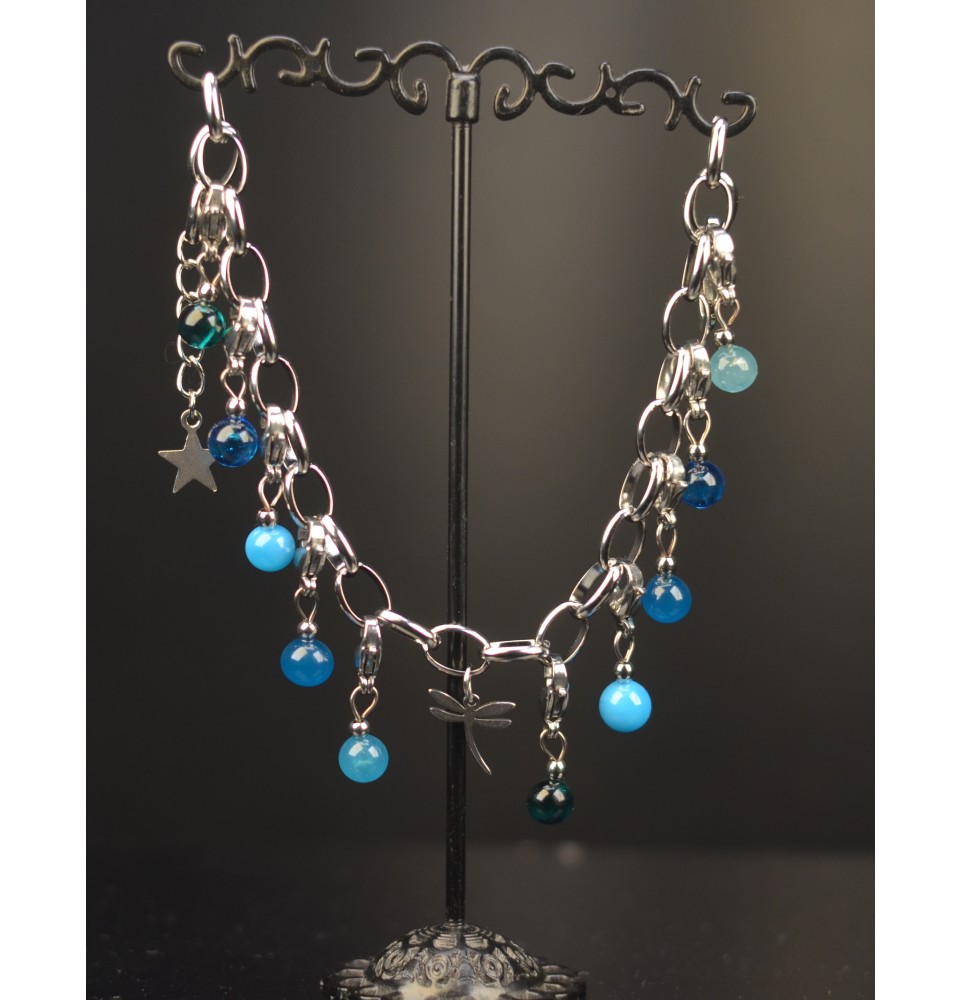 Découvrez ce bracelet charms en acier inoxydable, sublimé par des perles en verre filé entièrement réalisées à la main par Liloo Créations, dans son atelier à Orange.