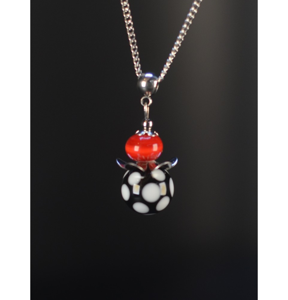 Collier girly en acier inoxydable avec 2 perles de verre filé artisanales rouge, noir et blanc.