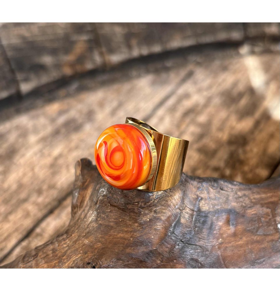 Sublimez vos mains avec cette bague large réglable en acier inoxydable doré, conçue pour apporter élégance et originalité à votre style. Son cabochon en verre filé artisanal de 1,8 cm de diamètre est entièrement façonné à la main dans l’atelier de Liloo Créations à Orange, garantissant une pièce unique et originale à chaque bague.