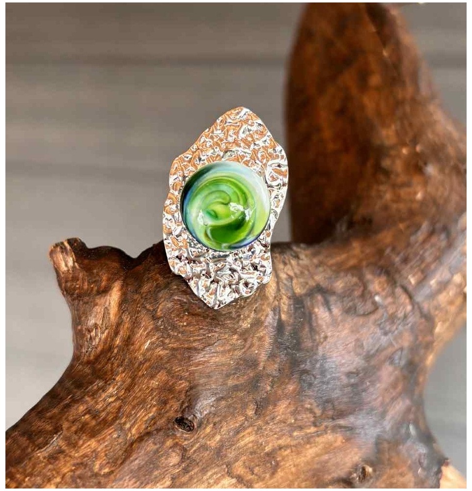 Bague réglable femme en acier inoxydable martelé avec cabochon en verre filé – bijou artisanal fait main Liloo Créations