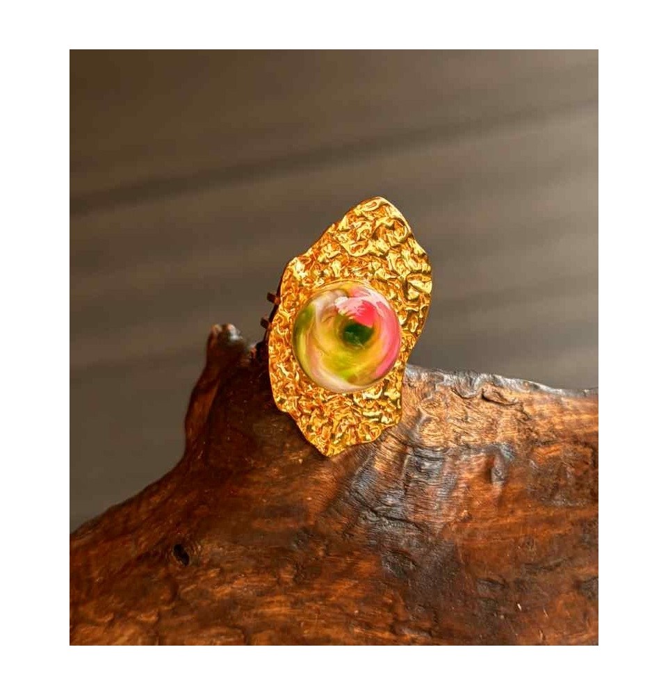 Bague réglable en acier inoxydable martelé, ornée d’un cabochon en verre filé à la main. Une création artisanale signée Liloo Créations, moderne, colorée et unique — parfaite pour sublimer toutes vos tenues.
