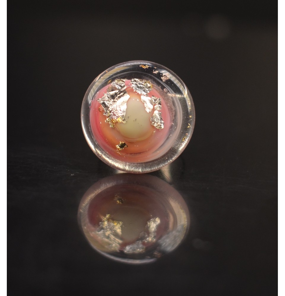 Le cabochon, d’un diamètre de 2,4 cm, offre un magnifique mélange de rose et blanc, sublimé par l’inclusion d’une feuille d’argent qui illumine la pièce de reflets scintillants. Le rendu est spectaculaire : un jeu de lumière vibrant et profond, impossible à reproduire à l’identique.
