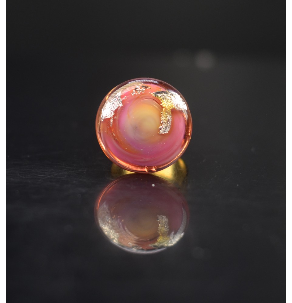Bague réglable en acier inoxydable Doré– Cabochon en verre filé artisanal ROSE, feuille d’argent (pièce unique)