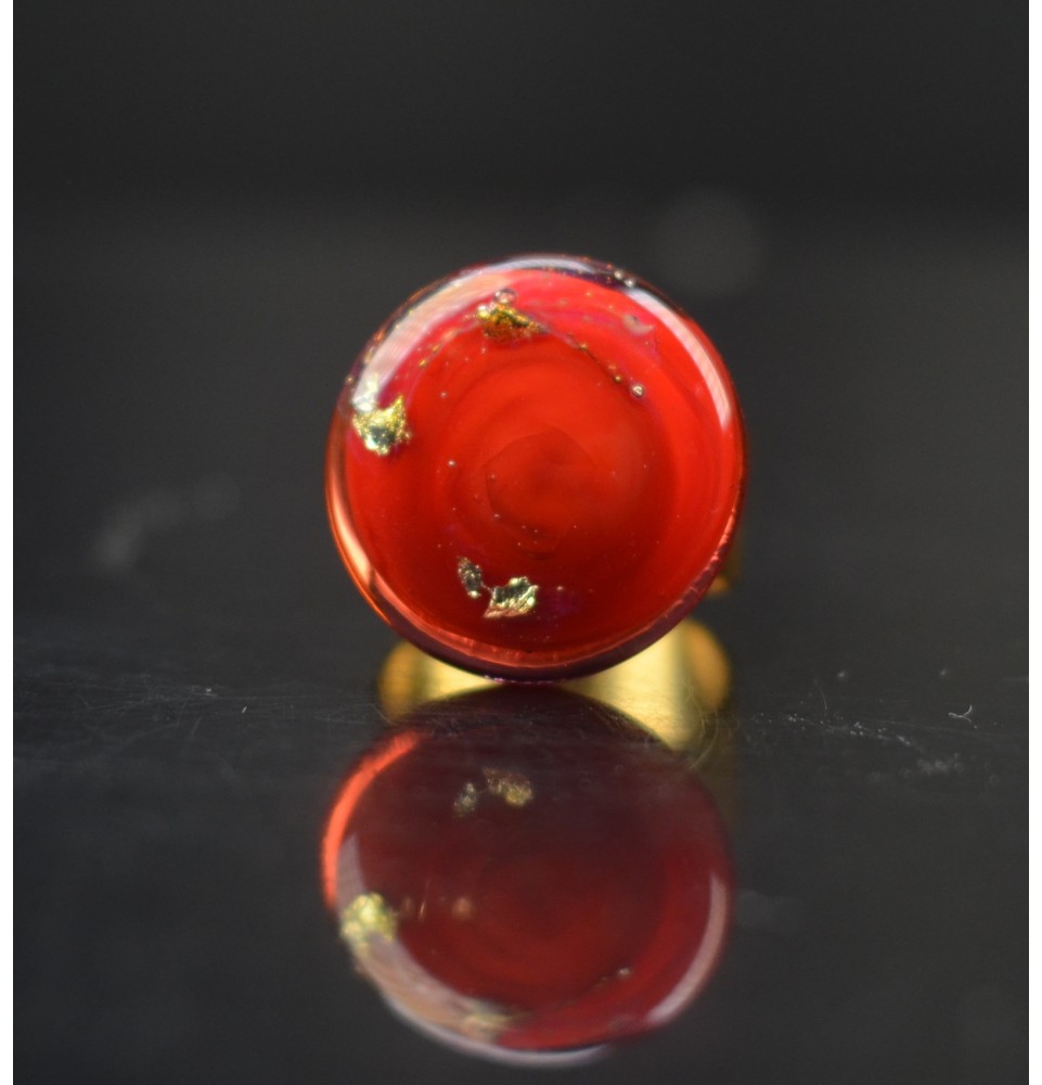 Bague réglable en acier inoxydable – Cabochon en verre filé artisanal ROUGE et feuille d’OR (pièce unique)