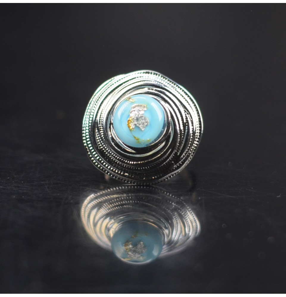 Bague en Verre Filé au Chalumeau "BLEU et feuille d'argent" - acier INOXYDABLE