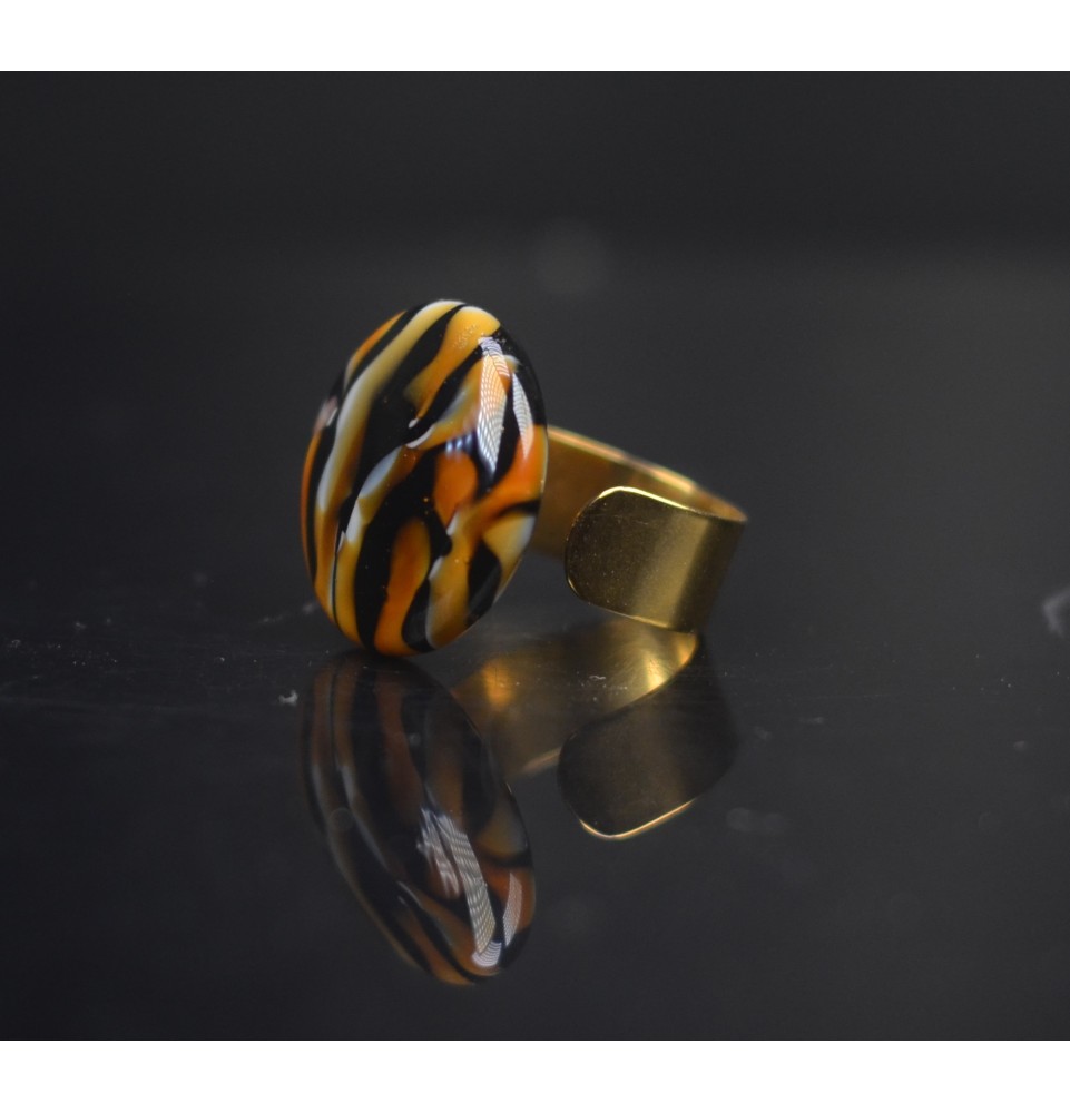 Bague réglable en acier inoxydable Doré– Cabochon en verre filé artisanal LEOPARD (pièce unique)