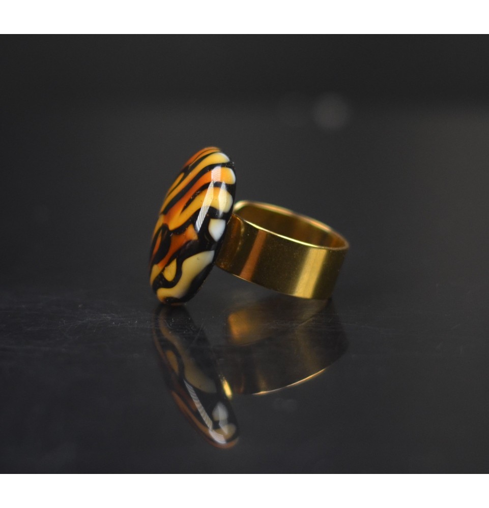 Bague cabochon léopard en verre filé – Acier inoxydable doré réglable