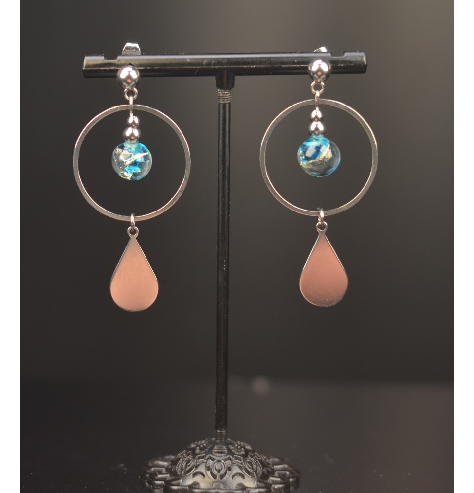 Boucles d'Oreilles en Acier Inoxydable avec Perles de Verre bleu et feuille d'argent
