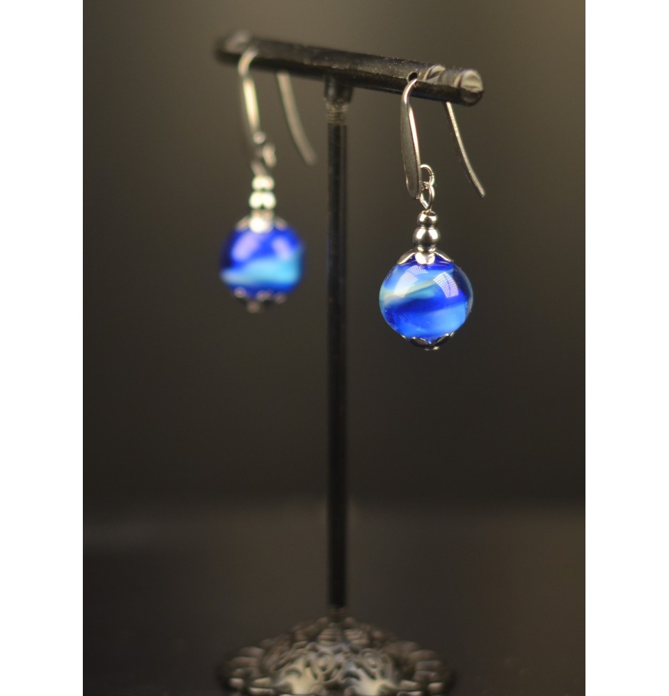 Chaque boucle met en valeur une perle de verre unique, de 1.3 cm de diamètre, d'une melange de 2 bleus. Montées sur des crochets en acier inoxydable, elles allient élégance et confort au quotidien.