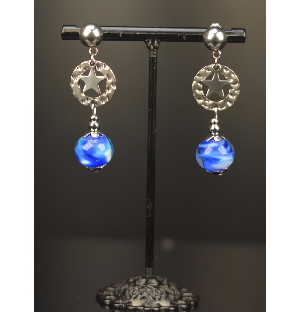 Chaque boucle met en valeur une perle de verre unique, de 1.3 cm de diamètre, d'une melange de 2 bleus. Montées sur des crochets en acier inoxydable, elles allient élégance et confort au quotidien.
