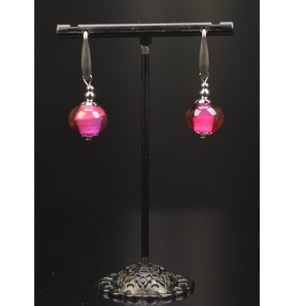 Élégantes et lumineuses, ces boucles d’oreilles en verre filé au chalumeau dévoilent un superbe rose violine mélangeant rose et violine.
