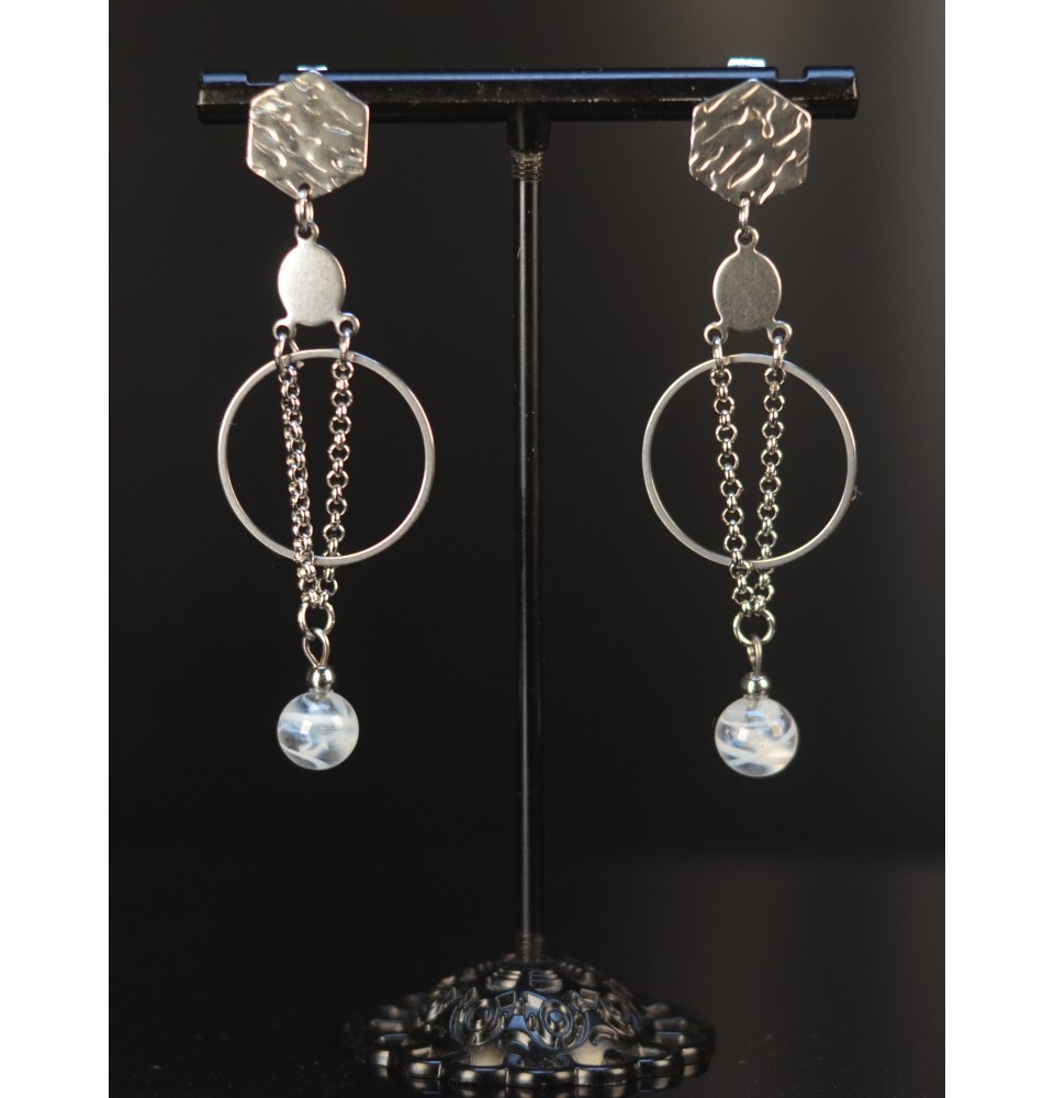Plongez dans l'élégance pure avec cette paire de boucles d'oreilles signée Liloo Créations, conçue et façonnée à la main dans notre atelier d'Orange. En acier inoxydable, ces boucles sont composées d'anneaux , subtilement assemblés, qui met en valeur la perle centrale. Sculptée avec soin, cette perle de verre filé arbore un blanc, un bijou unique créé au chalumeau par notre artisane.