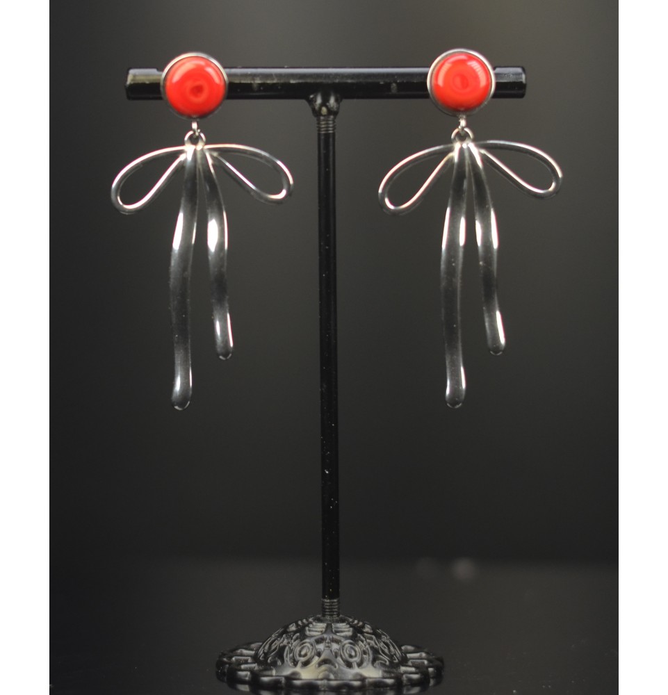Le modèle se compose d’un gros nœud délicatement travaillé, suspendu sous un cabochon de verre artisanal de 8 mm de diamètre, d’un rouge profond et lumineux. L’ensemble est monté sur des crochets en acier inoxydable, garantissant confort et durabilité, même pour les peaux sensibles.