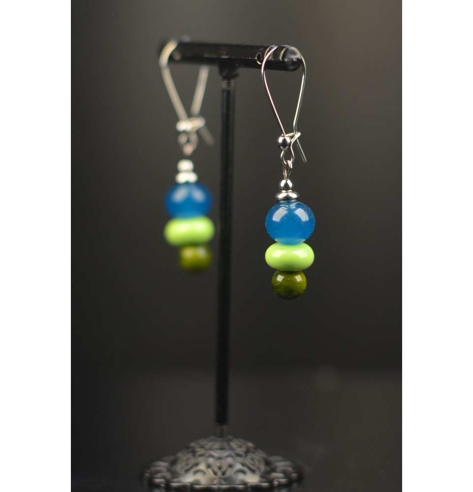 Boucles d’oreilles en acier inoxydable et perles de verre filé – Modèle « Trio de Lumière »