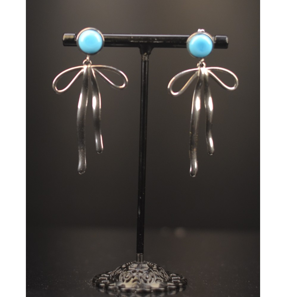 Le modèle se compose d’un gros nœud délicatement travaillé, suspendu sous un cabochon de verre artisanal de 8 mm de diamètre, d’un TURQUOISE profond et lumineux. L’ensemble est monté sur des crochets en acier inoxydable, garantissant confort et durabilité, même pour les peaux sensibles.