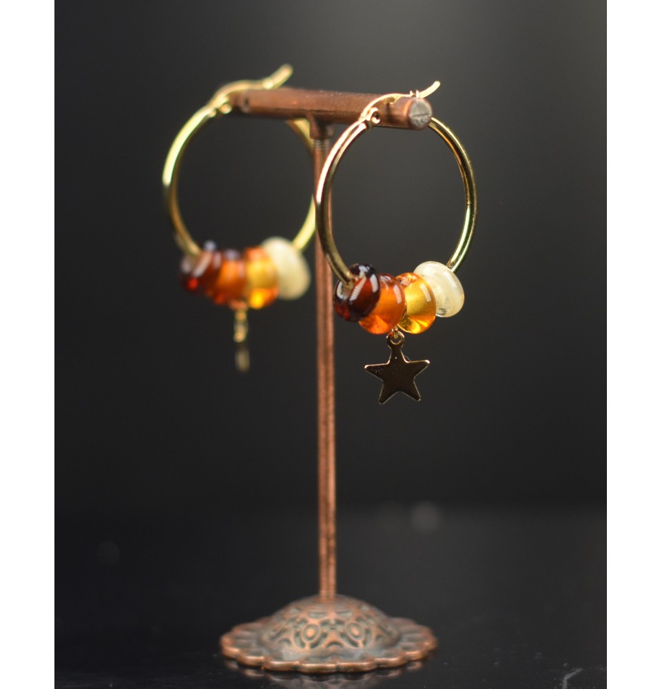 Créoles dorées en perles de verre filé – Dégradé ambré & étoile