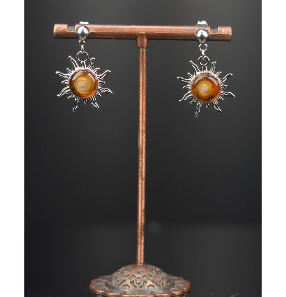 Boucles d’oreilles “Soleil ambré” – cabochon de verre filé à la flamme, acier inoxydable