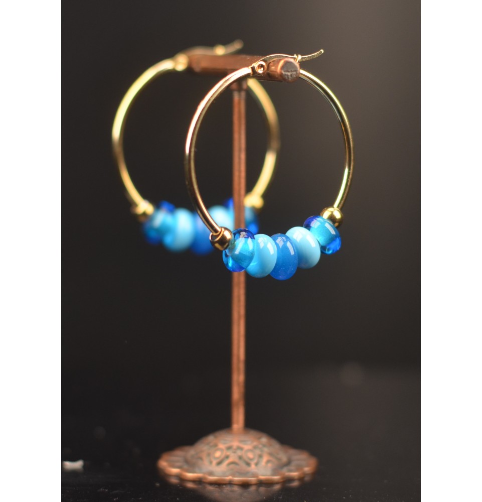 Créoles dorées 4 cm en perles de verre filé – BLEU - acier inoxydable
