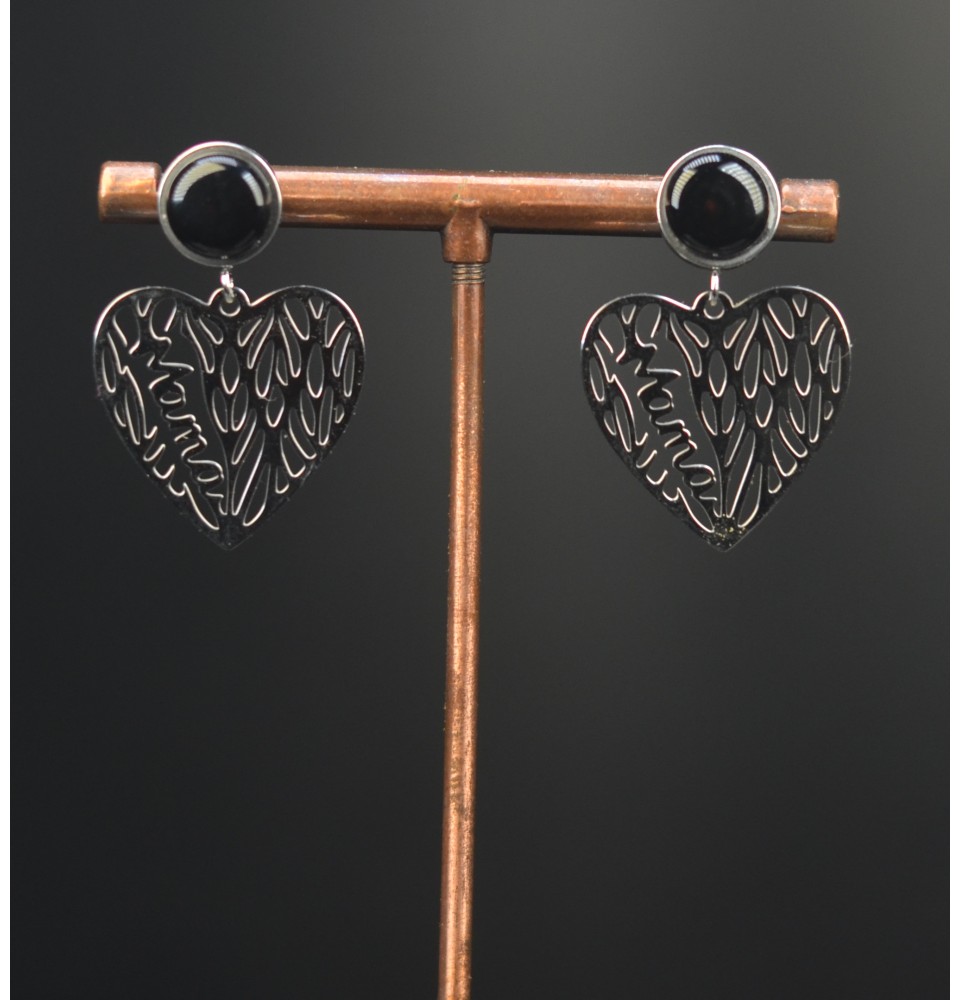 Boucles d’oreilles pendantes “Maman” – Cœur en acier inoxydable et cabochon de verre NOIR