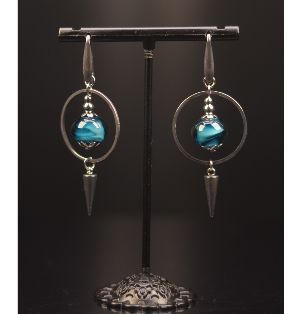 Chaque perle est façonnée à la main au chalumeau dans mon atelier, selon la technique du verre filé. Cette teinte bleu pétrole profonde et lumineuse est aujourd’hui introuvable, le fournisseur ayant cessé sa production. Cette paire est donc la seule disponible.