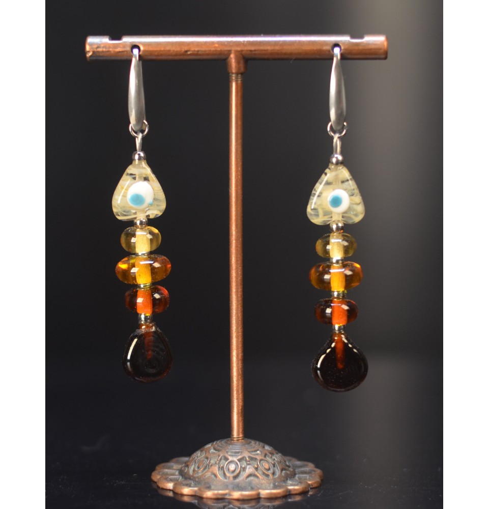 Boucles d’oreilles en forme de poisson en verre filé artisanal, composées de perles aux nuances ambrées en dégradé.