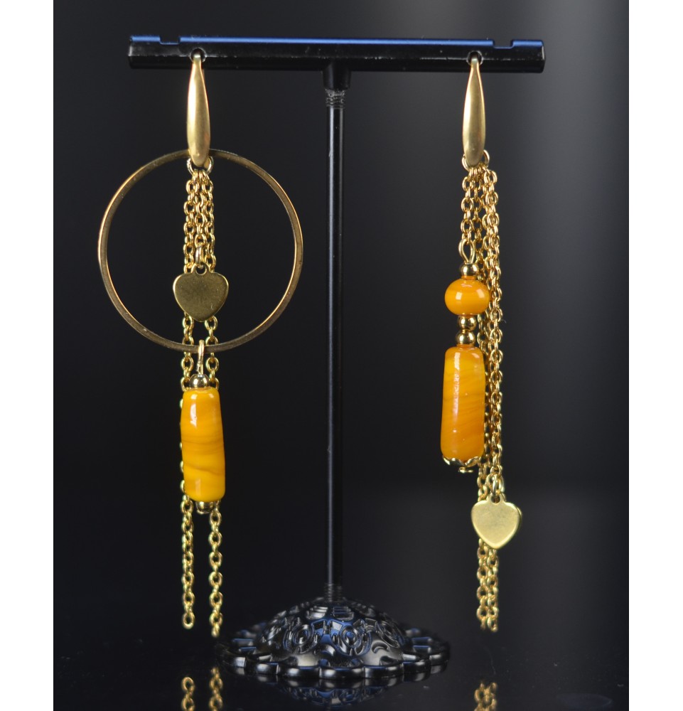 Boucles d’oreilles dépareillées "jaune moutarde" – Tubes en verre filé & acier doré
