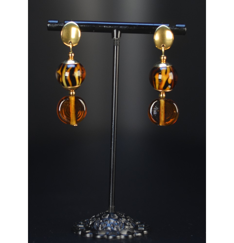 Boucles d’oreilles léopard & ambre – Verre filé & acier inoxydable doré