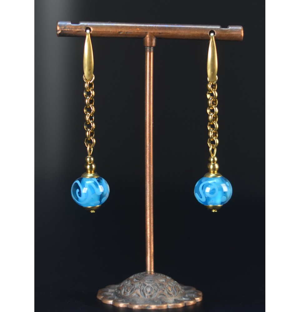 Boucles d’oreilles en perles verre filé – BLEU turqoise - acier inoxydable doré