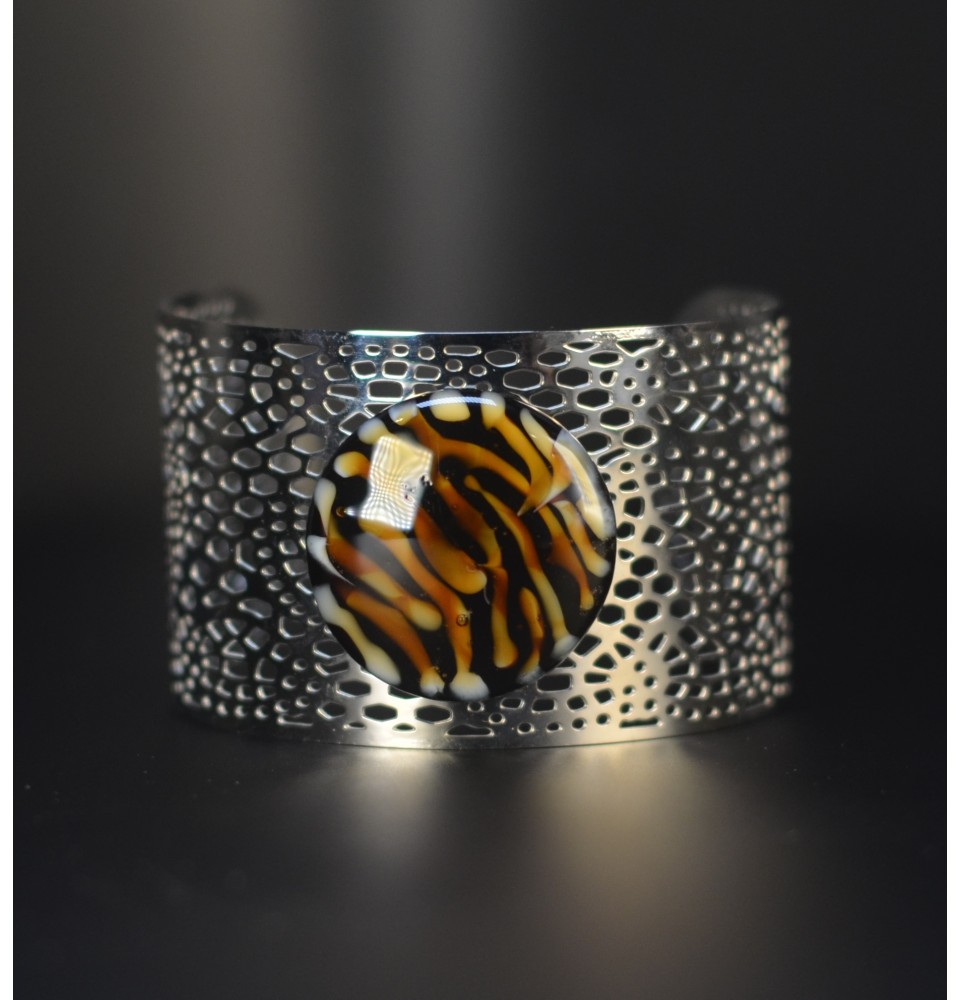 Au centre de cette manchette de 4 cm de large, se trouve un cabochon en verre créé par l’artisane elle-même, avec un motif léopard : . Chaque cabochon étant façonné à la main, chaque bracelet devient une pièce unique, impossible à reproduire à l’identique.