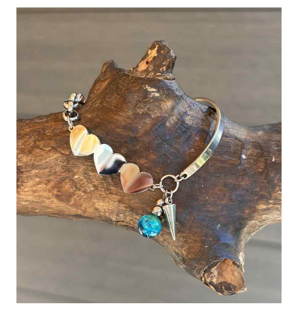 Laissez-vous séduire par l’élégance et l’authenticité de ce bracelet demi-jonc en acier inoxydable, orné d’une perle en verre filé au chalumeau, entièrement façonné à la main dans l’atelier Liloo Créations à Orange.