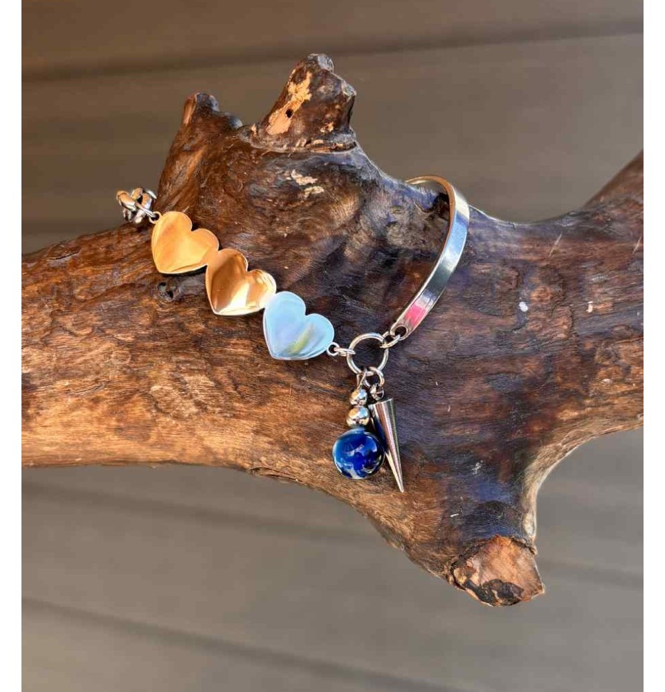 Laissez-vous séduire par l’élégance et l’authenticité de ce bracelet demi-jonc en acier inoxydable, orné d’un cabochon en verre filé au chalumeau, entièrement façonné à la main dans l’atelier Liloo Créations à Orange.