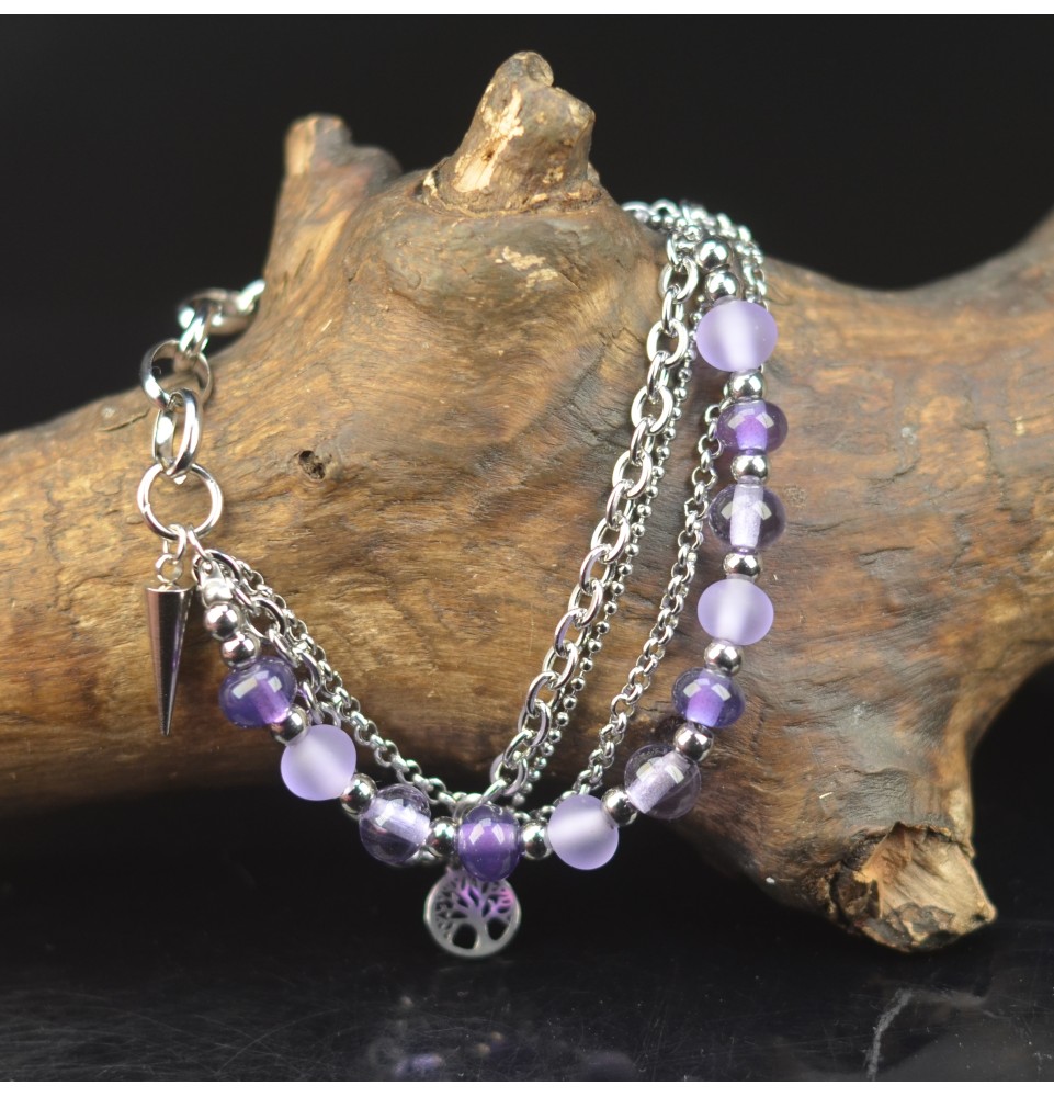 Le bracelet se compose de plusieurs rangs de chaînes en acier inoxydable, superposées pour un effet graphique et moderne, avec un petit arbre de vie placé au centre, symbole d’harmonie et de vitalité.