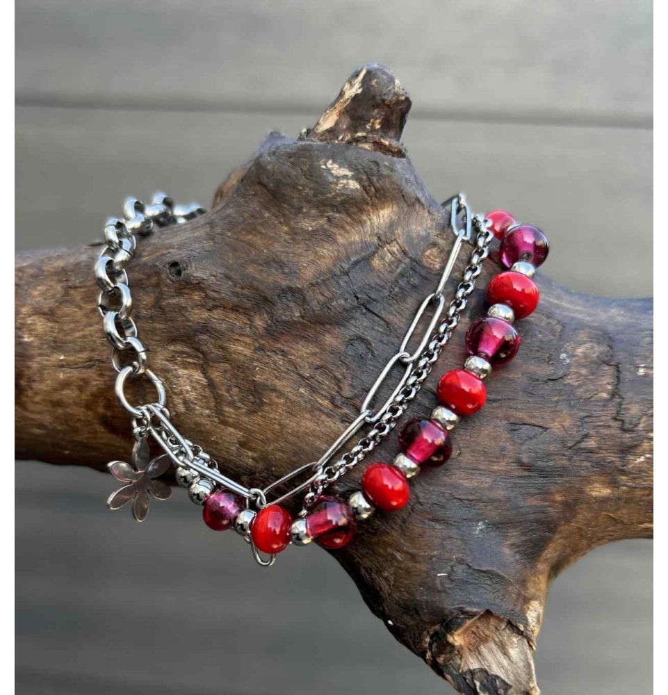 Bracelet multi-rangs en acier inoxydable et perles de verre filé – Modèle Unique - rouge et rubis