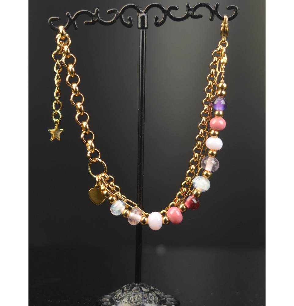 Bracelet multirangs en acier inoxydable doré, orné de perles de verre filé ROSE, façonnées à la main dans l’atelier Liloo Créations à Orange. Ce nouveau modèle associe plusieurs chaînes superposées pour un rendu élégant et moderne, complété par une breloque COEUR.