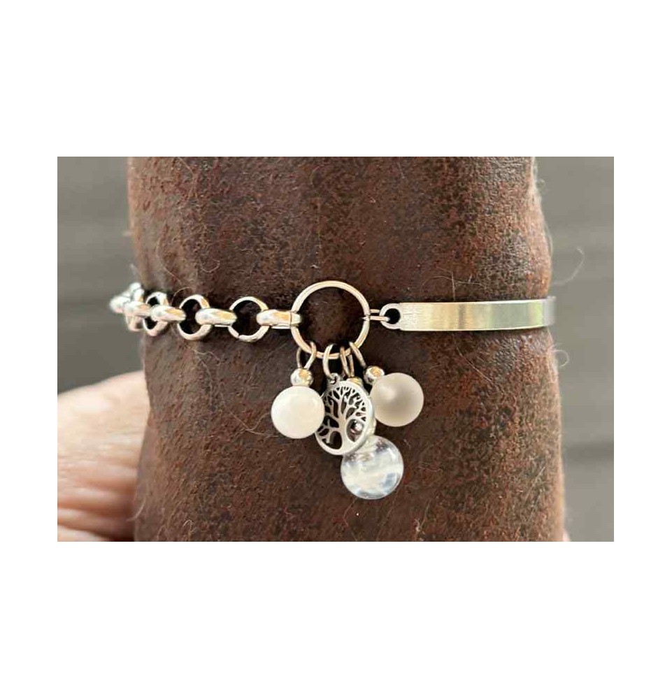 Ce bracelet associe avec élégance un demi-jonc en acier inoxydable à une chaîne à gros maillons de 6 mm, pour un rendu à la fois structuré et tendance. Il est délicatement orné de trois petites perles de verre blanches, entièrement filées au chalumeau à la main, faisant de chaque pièce une création unique. Une breloque Arbre de Vie vient compléter l’ensemble, symbole de force, d’équilibre et de renouveau.