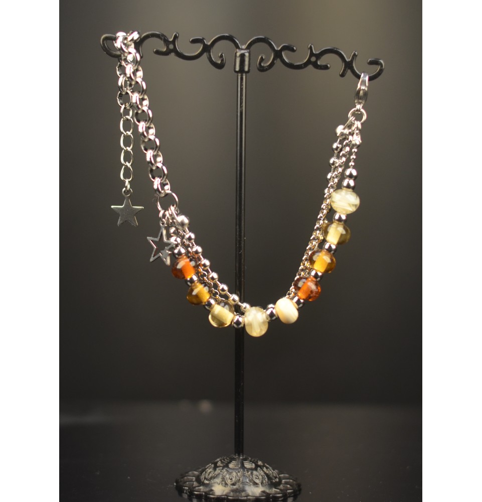 Découvrez ce nouveau modèle de bracelet signé Liloo Créations, alliant élégance contemporaine et savoir-faire artisanal. Chaque bracelet est confectionné à la main dans notre atelier à Orange, avec des perles de verre filées au chalumeau, uniques et EN DEGRADE AMBRE , séparées par de délicates perles argentées.