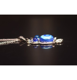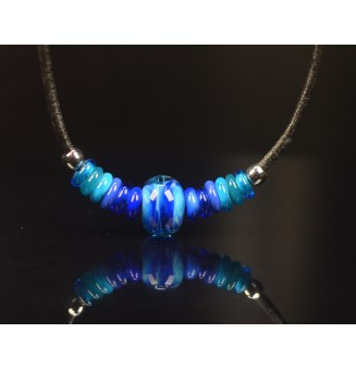 22,00 €Au cœur de ce bijou se dévoile une perle de verre filée au chalumeau, entièrement réalisée par l’artisane. Sa teinte bleue profonde, à la fois douce et vibrante, capte la lumière et apporte une touche de fraîcheur et de poésie à votre tenue. Chaque perle est unique, façonnée une à une, ce qui rend ce collier absolument singulier.