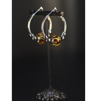 23,00 €Boucles d’oreilles en acier inoxydable avec 2 perles de verre filé artisanales : une perle ronde motif léopard et une perle plate ronde ambre.