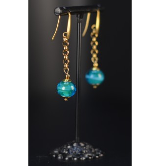 20,00 €Boucles d’oreilles pendantes en acier inoxydable doré avec perles de verre filé bleu vert. Montées sur chaîne pour un joli mouvement. Légères, lumineuses et pièce unique.